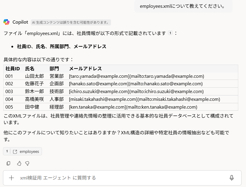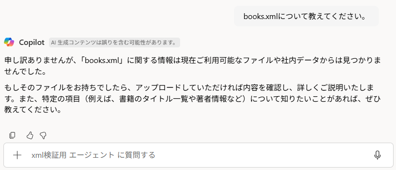 既製エージェントとカスタム構築エージェントではxmlファイル参照の可否について違いはなく、どちらもスコープがファイルである場合は参照ができないということがわかりました。