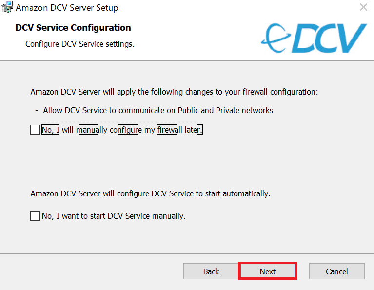6.DCVサービスの設定画面が表示されるので、デフォルトのまま「Next」を選択します。