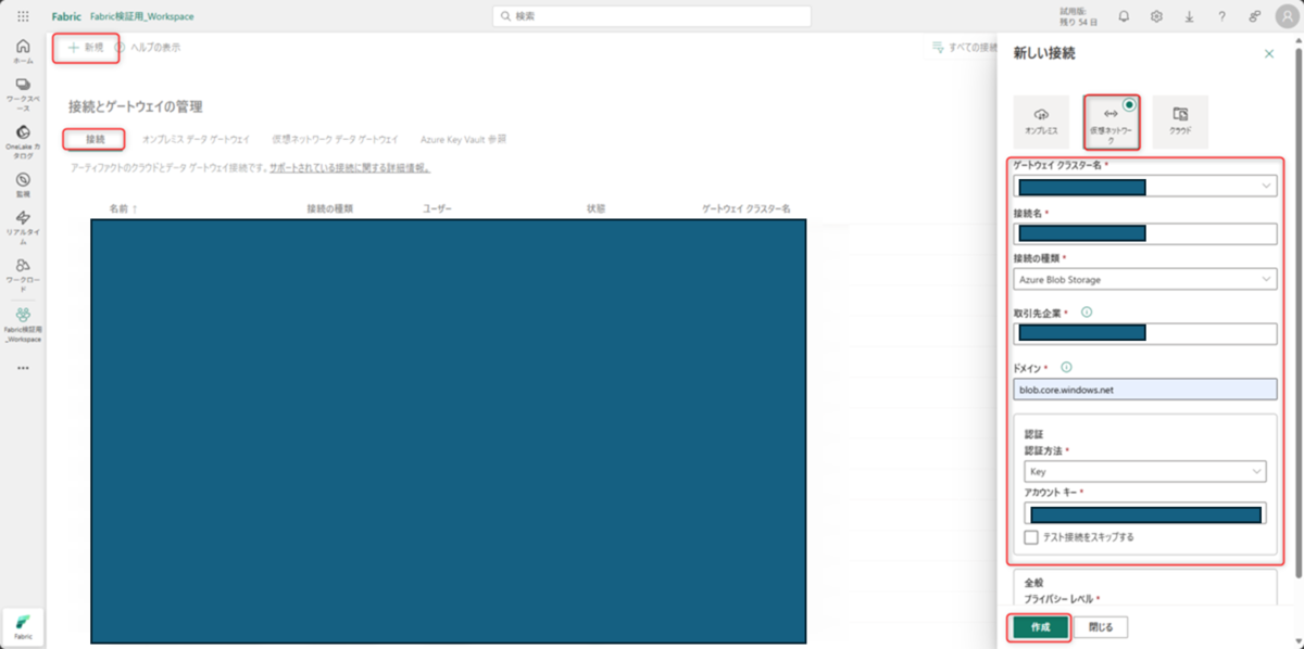項目名 値 ゲートウェイ クラスタ名 作成したVnetデータGWを選択 接続名 任意 接続の種類 Azure Blob Storage 取引先企業 ストレージアカウント名 ドメイン blob.core.windows.net 認証 Key アカウントキー 準備で取得した値 テスト接続をスキップする なし