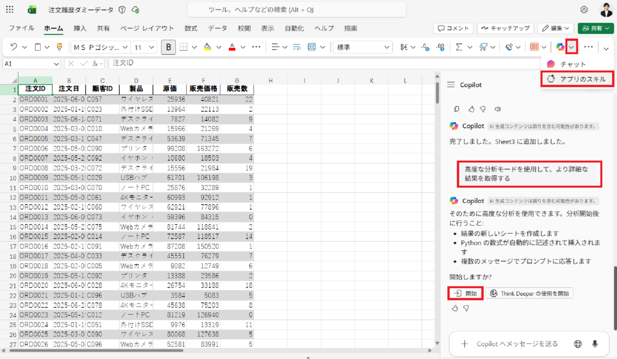 または、ExcelのCopilot [アプリのスキル] を開き、チャットに「高度な分析モードを使用して、より詳細な結果を取得する」と打ち込み、[開始] をクリックした状態です。