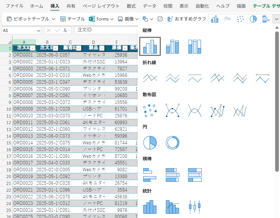 - [挿入]タブから選択できない表の種類(例:バブルチャート など)はラベルやレイアウトが不完全になることがあり、修正が必要になることがあります(弱み)